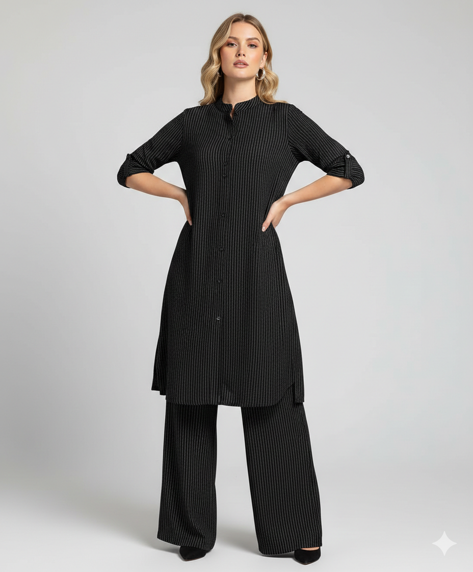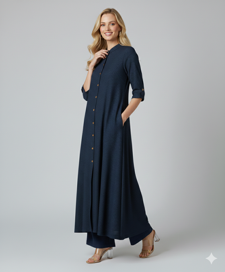 The Tunic: A floor-length, A-line longline tunic with a full-length button-down front that provides a...