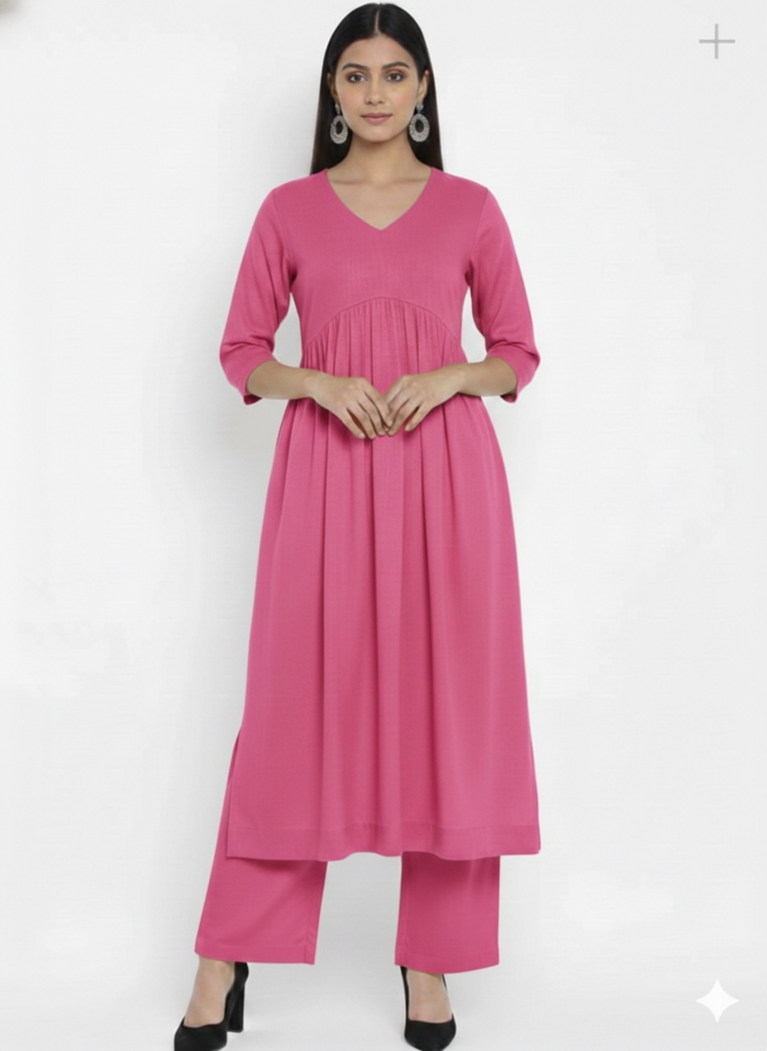 Crysta The v-Neck pink Cotton Kurta Set The Calf Leight Kurta With Stylish Long Side...