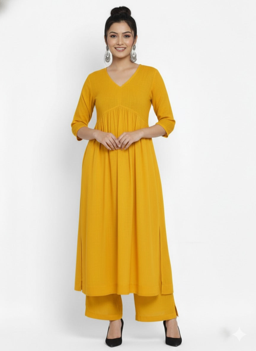 Milano The v-Neck Mustrad Yellow Cotton Kurta Set The Calf Leight Kurta With Stylish Long...
