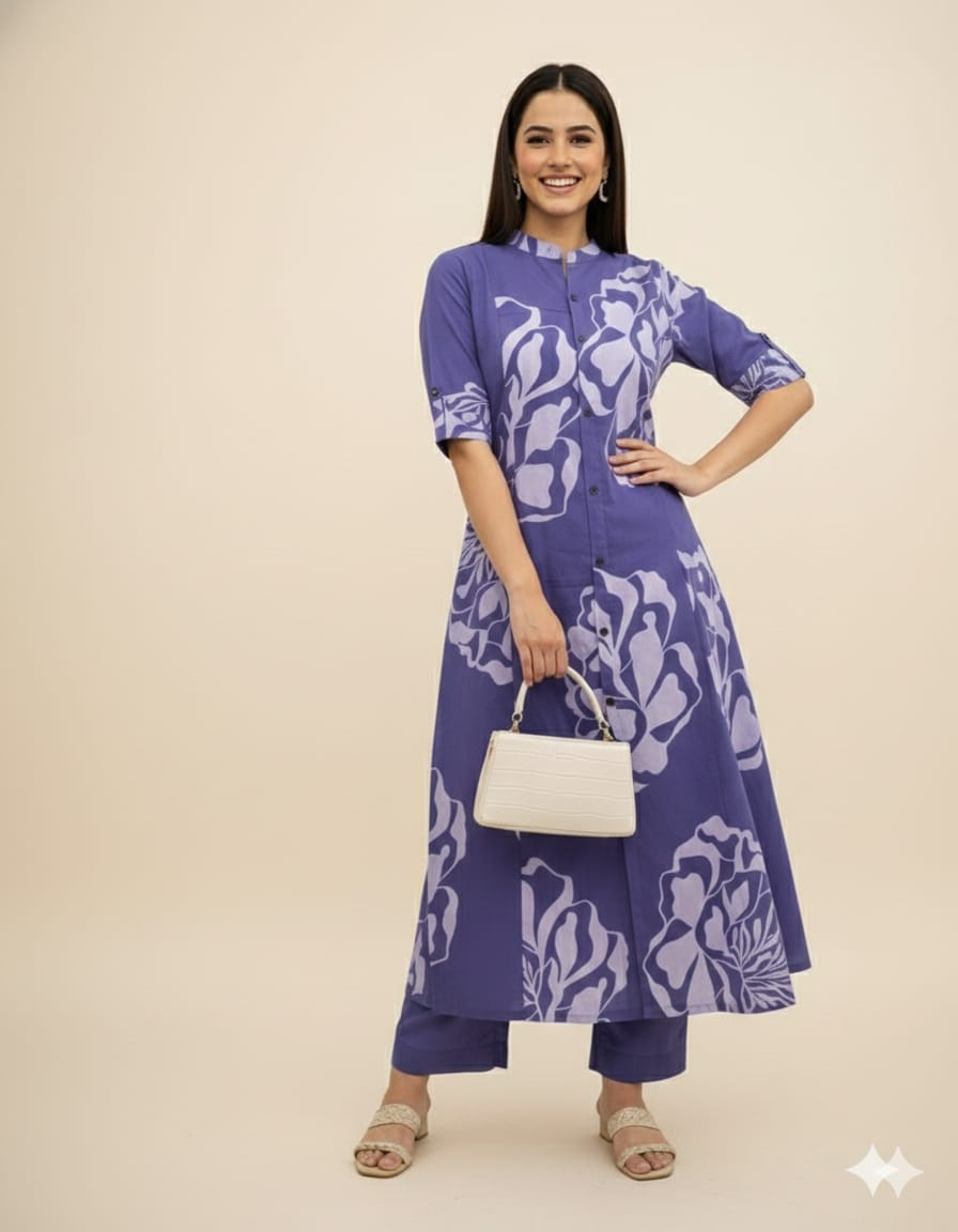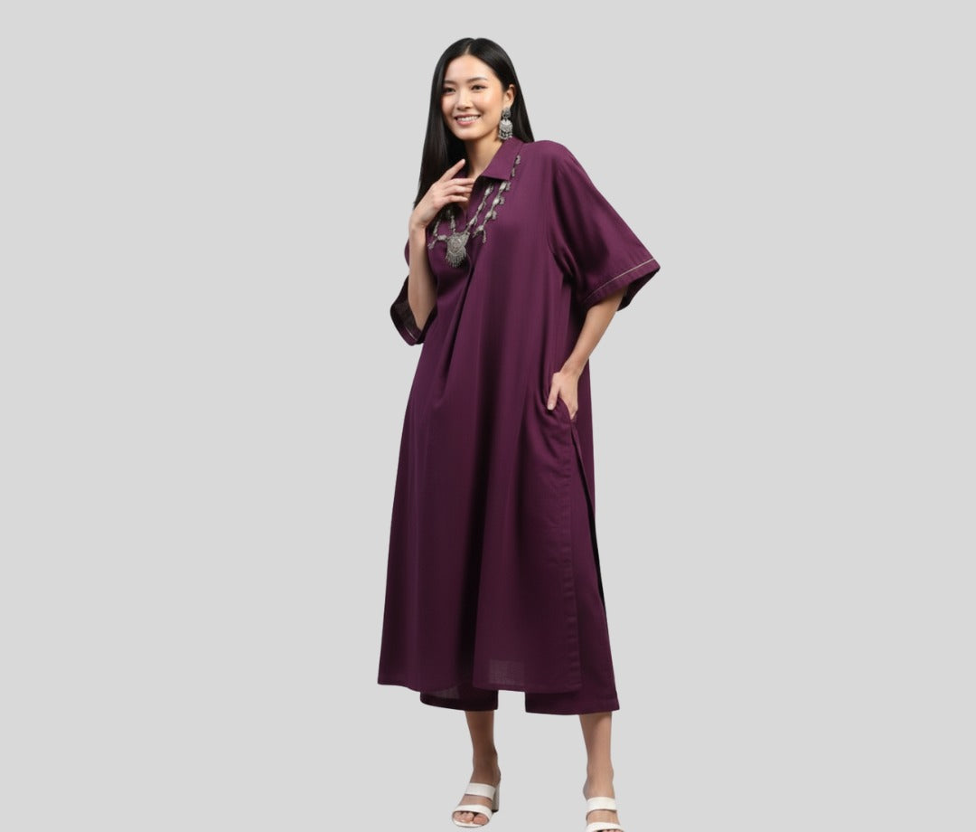 Heliotrope Stylish Co-ord Set With Collared And Brown Trimmings