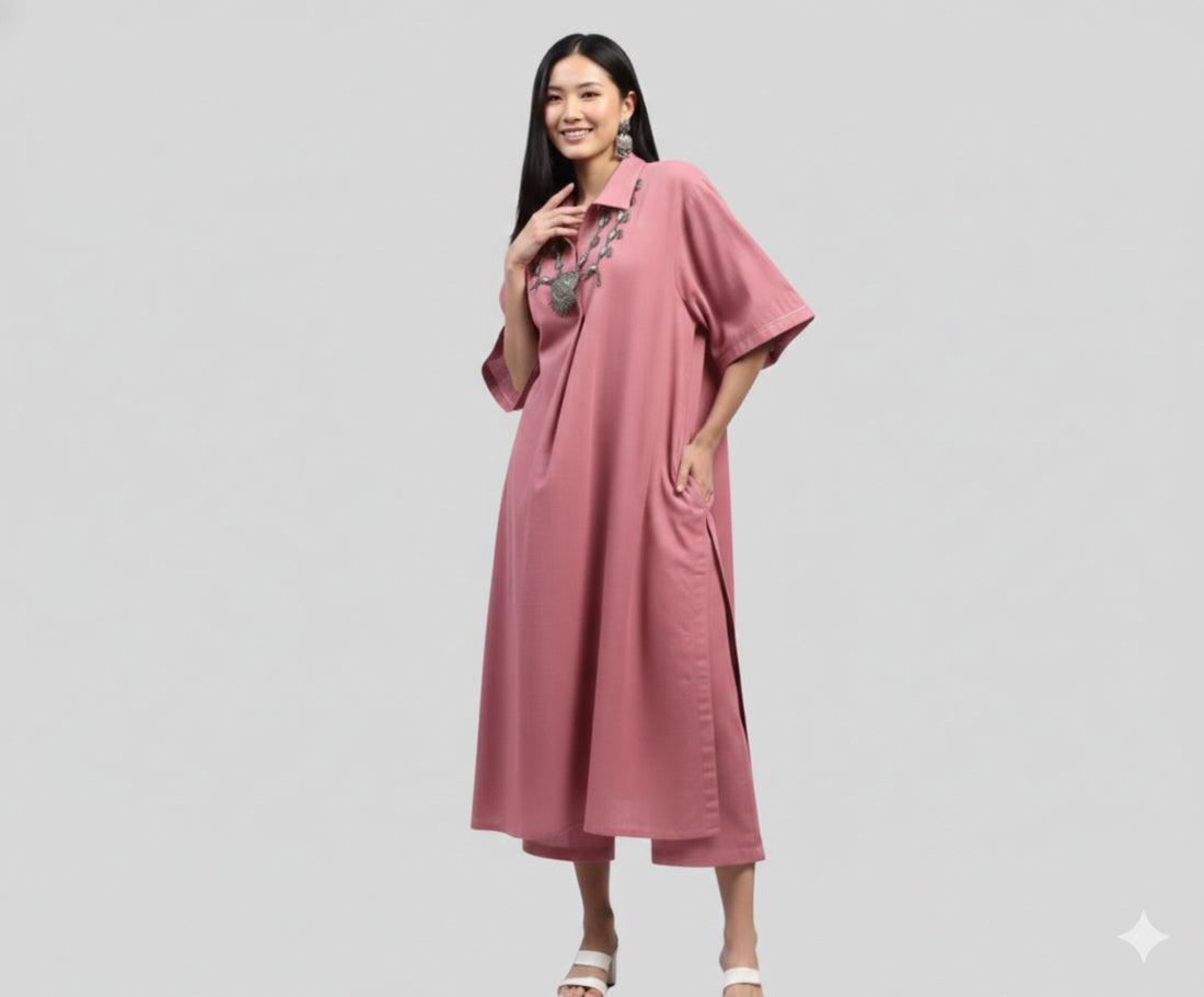 Mauve Stylish Co-ord Set With Collared And Brown Trimmings