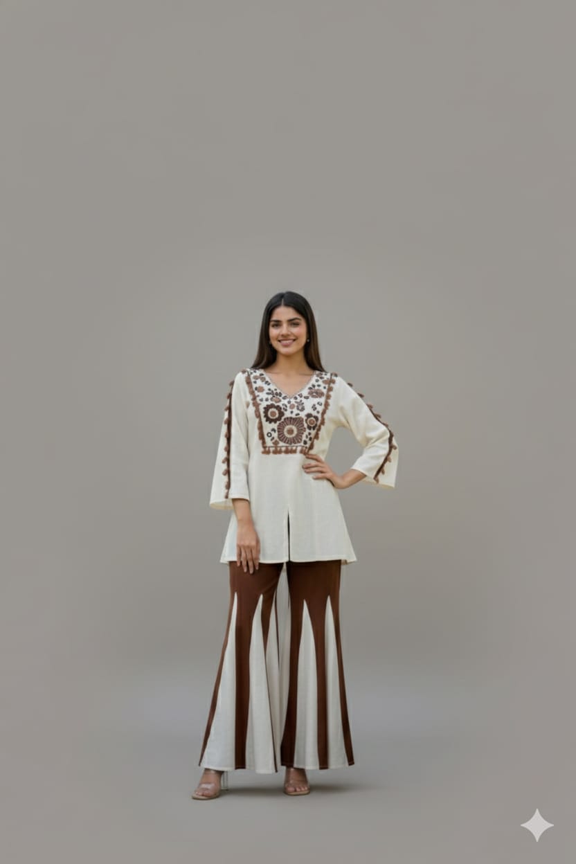 Ivory Stylish Co-ord Set With Collared And Brown Trimmings