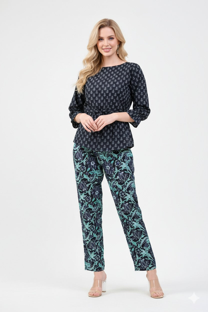 A rhythmic, light-blue geometric or leaf-inspired motif set against a deep teal base.A classic hip-length...