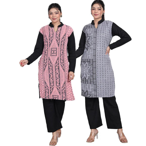 This woolen kurti suit is crafted with soft, warm fabric that feels cozy yet stylish. The elegant design comes with neat detailing, perfect for winter comfort. Light in weight but rich in look, this outfit blends traditional charm with modern style—ideal for everyday wear, outings, and festive moments.