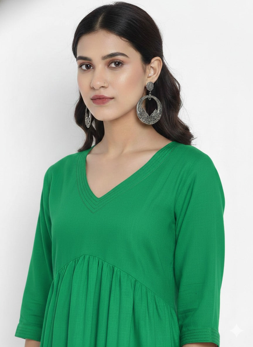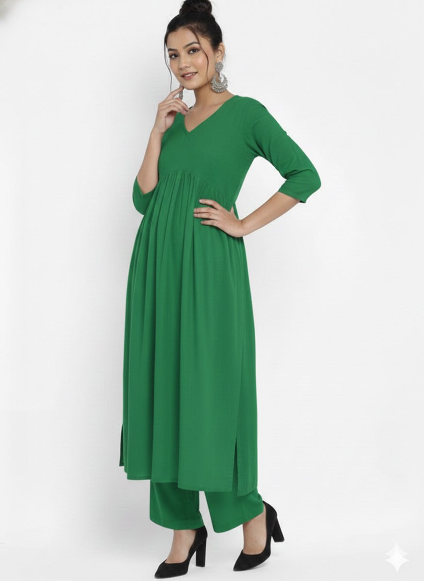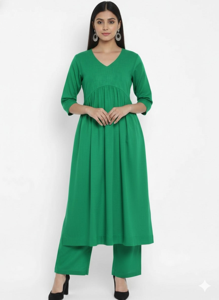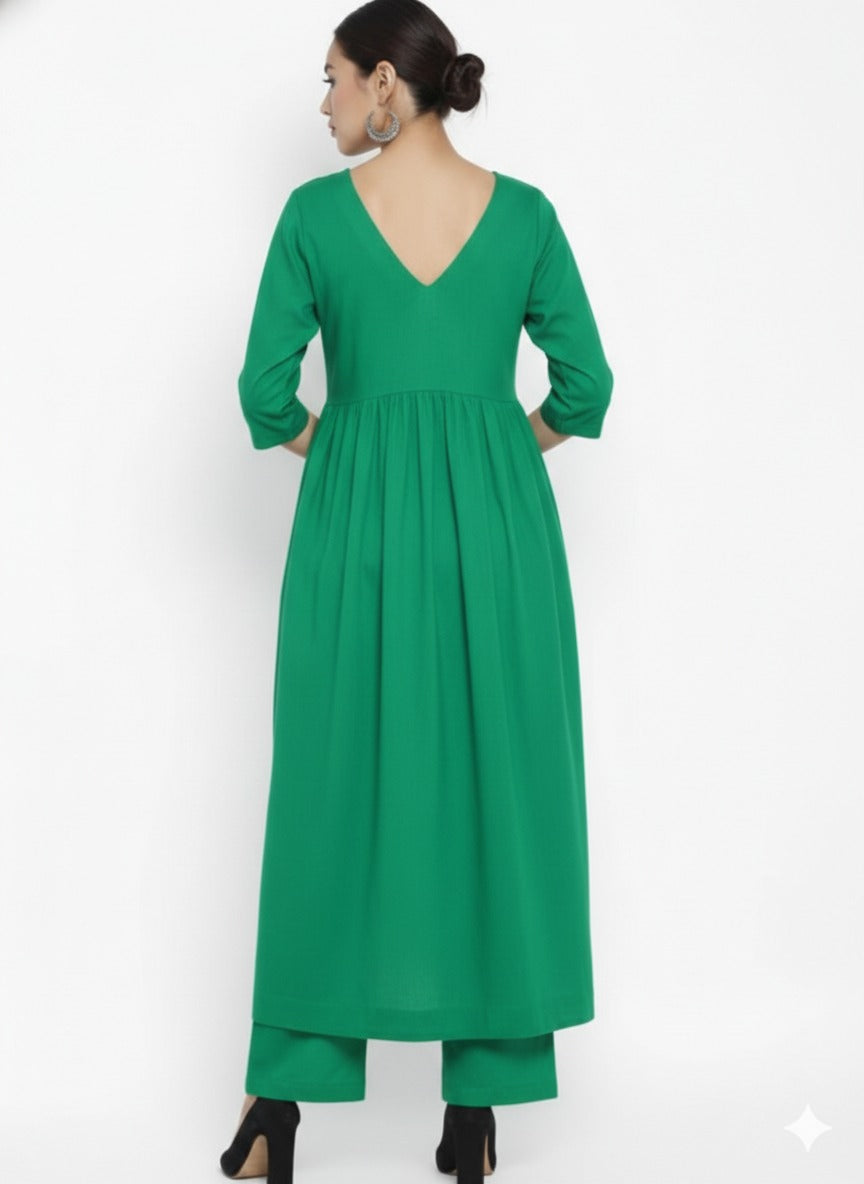 Naughty The v-Neck Green Cotton Kurta Set The Calf Leight Kurta With Stylish Long Side Slit Set has V-Neck in Fontana The Deep Stylish V-Neck In Back With Folded SlevesThe Kurta Beautiful and Modern Silhouette