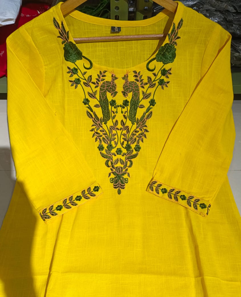 👉KURTA- PURE COTTON SLUB KURTI WITH INTRICATE EMBROIDERY WORK ON YOKE AND SLEEVES AND HEM